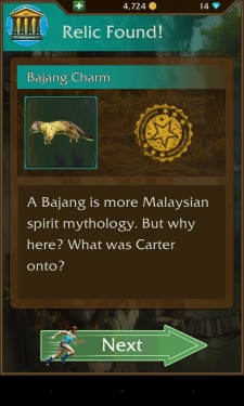 The Bajang Charm is a Relic found in Lara Croft: Relic Run. It is the eighth relic that can be found in the Jungle Temple after collecting ten clues in the 16 level. (Originally 16 clues in endless mode before version 1.5.68.)