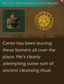 The Bronze Mahakala Incense Burner is a Relic found in Lara Croft: Relic Run. It is the 15th relic and can be found level 110, the 30th in the Mountain Pass region, after collecting ?? clues.
