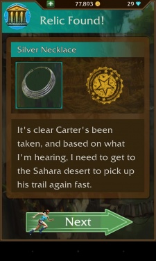The Silver Necklace is a Relic found in Lara Croft: Relic Run. It is the 19th relic that can be found in the Jungle Temple after collecting 26 clues in the level 38. (Originally 71 clues in endless mode before version 1.5.68.)