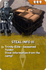 Steal Info is a set of Remnant Resistance Expedition Cards in Rise of the Tomb Raider to be used when designing Remnant Resistance missions. These are objective cards and each tier is associated with a different level of difficulty. Each tier also has three different versions to determine the rank of enemies.