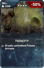 Toxicity is one of the Expedition Cards in Rise of the Tomb Raider to be used in one of the Expeditions, like Score Attack, Chapter Replay, Chapter Replay Elite, Remnant Resistance and Endurance Mode.