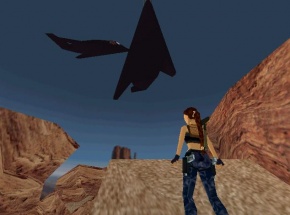 Lara begins the level Nevada Desert sliding down a cliff side slope and into a rocky valley below where a rock arch can be clearly seen up ahead. This large area has two vultures and two rattlesnakes, and the formers appear at the very left point of the rock arch when you move ahead from the starting position. At the back of this valley is a small rocky path leading up to an area with a strange metal structure, which you cannot climb on from you current position. Move around to the edge of this area and witness a aircraft, specifically a B-2 Stealth Bomber doing practice, fly over Lara's head (they don't cause any damage). Although you cannot see it, there is a small hole in this structure leading down below, and the objective is to traverse the ledges above the valley where you started the level, then across the rock arch, then finally through the hole. If you haven't seen the plane yet, and are about to begin the aforementioned path to get to to the hole, make sure you wait for it to pass or Lara can be get knocked away from her intended target by it. At the bottom of the hole is a water filled tunnel that takes you to another canyon area. The main objective of this section is to reach the area behind those two waterfalls to the left when you enter the area. To do that you must scale several ledges around this canyon, fighting several nasty vultures on your way. It doesn't matter if you fall in the water, as there is an easy way up and several pick-ups on the floor.Just before entering the area behind the waterfall, you will find a cave with a Detonator Plunger with a wire leading down to a box of TNT. This may be familiar with those who know the Tomb Raider II level Bartoli's Hideout. Like that time, a Detonator Switch is required for the TNT to explode, providing an access to another area.
