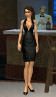 Lara's Evening Dress appears to be a variant of a Little Black Dress. In the beginning of the Japan level, Lara enters the party room wearing a pair of peep-toe high heels and the un-ripped dress. When she is 'formal' her hair is unbraided. When fighting starts, a cut scene appears and shows Lara dive behind the bar and 'rip' her dress. She rips off the sides of her dress and kicks off her high heels. The cutscene ends with Lara Croft jumping out from behind the bar, barefoot and with braided hair.