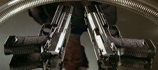 In the first movie, as well as in the games, Lara uses a silver weapon with black grips and a black base of the shaft. In the Cradle of Life her guns are much larger and a darker grey all over, rather than silver and black.