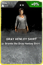 Gray Henley Shirt is a set of Expedition Cards in Rise of the Tomb Raider to be used in one of the Expeditions, like Score Attack, Chapter Replay, Chapter Replay Elite, Remnant Resistance and Endurance Mode. The cards have different tiers, each of which with their own properties and score modifiers.