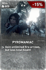 Pyromaniac is one of the Expedition Cards in Rise of the Tomb Raider to be used in one of the Expeditions, like Score Attack, Chapter Replay, Chapter Replay Elite, Remnant Resistance and Endurance Mode.